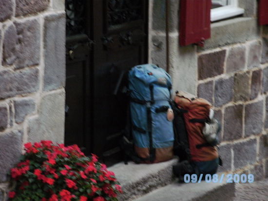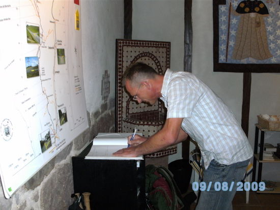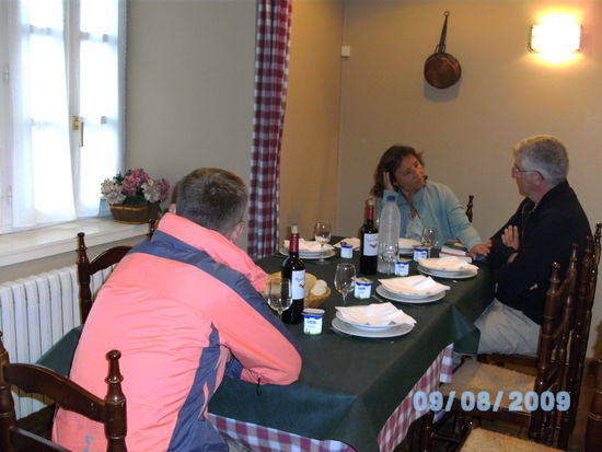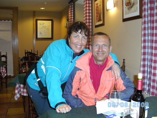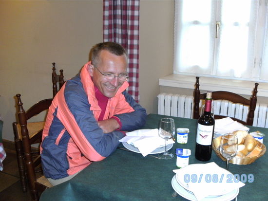In der einen Gaststätte wollten wir dann ein Pilgermenü essen. Wir wussten noch nicht wie das läuft und wunderten uns dass es dies erst 19.00 Uhr gibt. So warteten wir über eine Stunde und ruhten uns einfach nur aus. Dann wurden wir aber belohnt. Für 9€ pro Pilger gab es reichlich (Nudeln, Pommes, Forelle, Baguette, 1 Fl. Wein und Joghurt).