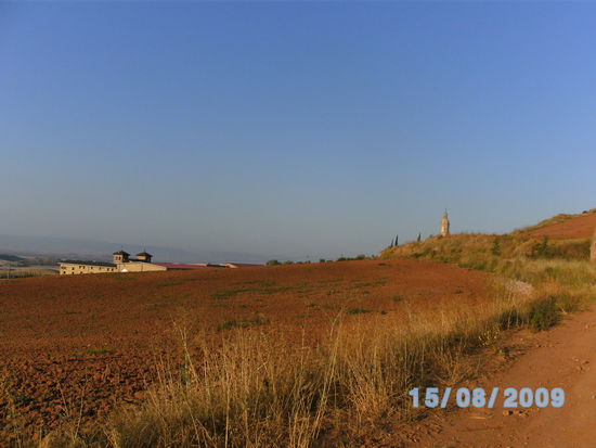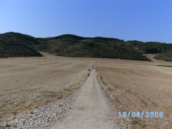 In der Ferne sieht man ein paar Pilger den Weg abkürzen, sie laufen quer Feld ein, die Sonne brennt hier gnadenlos.