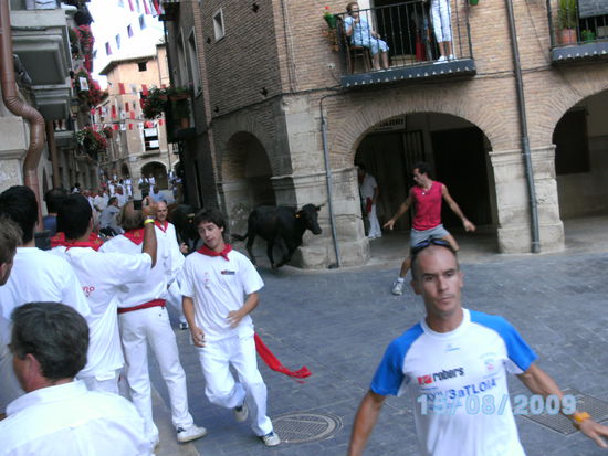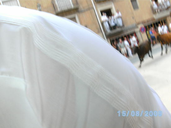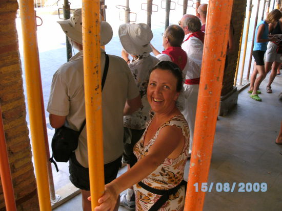 links neben mir der Herr in weiß und ich versuchen den einen Mann übers Gitter zu ziehen, der Stier hat ihn bereits mit einem Horn in die Seite gerammt, zum Glück fließt kein Blut, aber der Mann liegt am Boden und wir können ihm Gott sei Dank helfen.