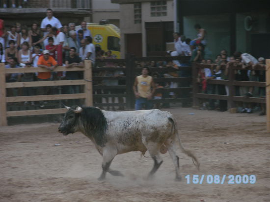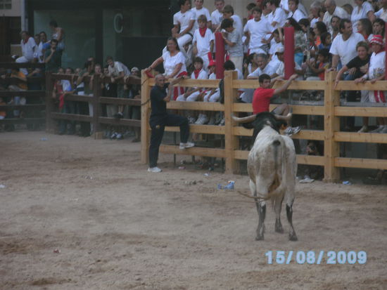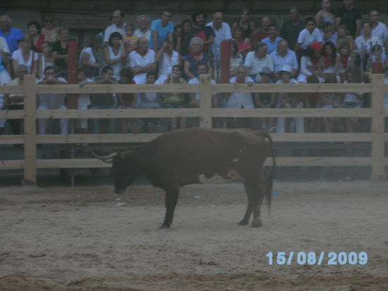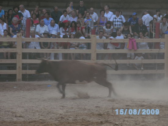 Hier wieder der Herr in Rot. Er schaffte es, so wie der Mann im gelben T-Shirt, dem Stier einen Ring auf's Horn zu setzen, was beklatscht und bejubelt wurde. Ist ein Tier erschöpft, so lässt man eine dicke Kuh mit Glocke in die Arena, der Stier wird sofort brav und geht mit ihr von dannen.
