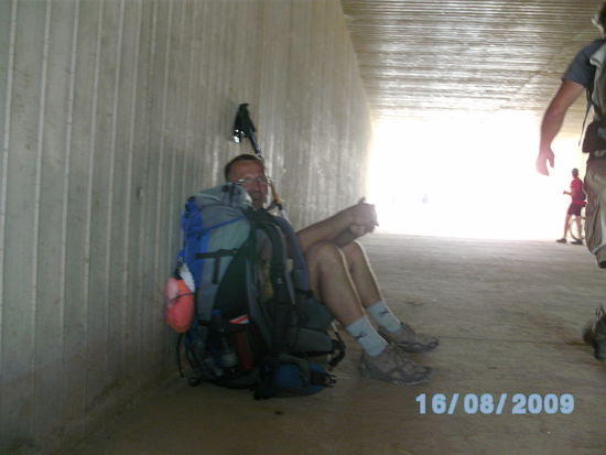 In dem Tunnel müssen wir Halt machen, auch wenn Logrono schon in Sicht ist. Wir müssen trinken und ich muss auch aus meinen Schuhen raus, die Füße an die Wand gestellt tut einfach nur gut. Auch wenn der Boden hier voller roter staubiger Erde ist.