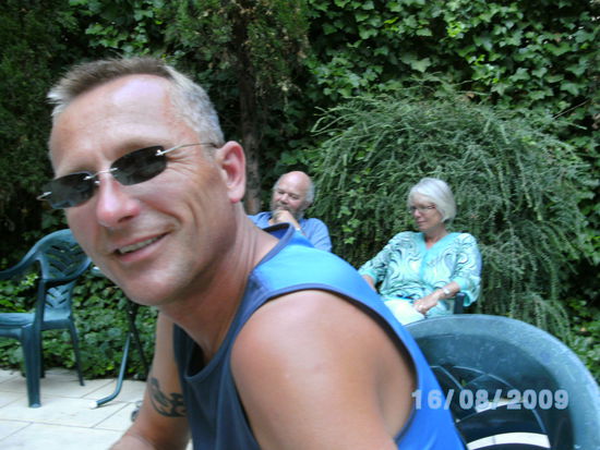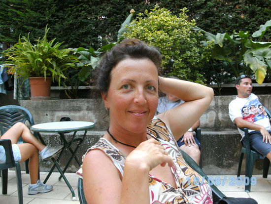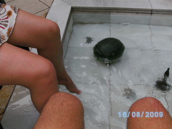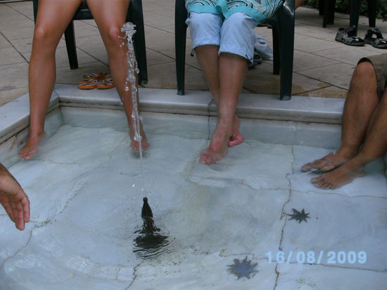 Wir lassen nicht nur die Füße baumeln, hier am "Fußbecken" trifft man sich und tauscht sich aus. Konversation mit vielen Nationalitäten. Hier im Innenhof trifft man sich eben und ein Rotwein der Rioja wird auch geleert.