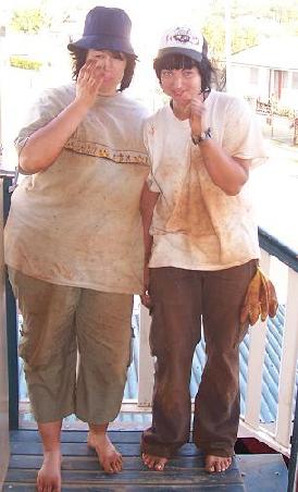 Zwei traurige kleine Joes nach einem harten Tag auf dem Feld. Man achte auch auf die dreckigen Fuesse. Socken und Schuhe schuetzen nicht wirklich vor dem roten Sand, der in jede Pore kriecht.