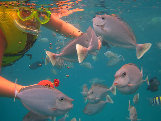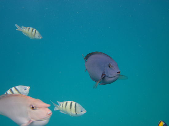 Ein paar bekommen wir auch zu sehen, aber die sind nicht wirklich zum spielen aufgelegt, so das wir erst zu einem anderen Stop fahren, an dem wir beim Schnorcheln viele bunte Fische bestaunen können.