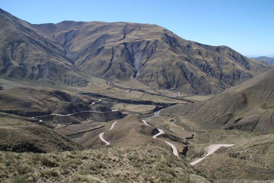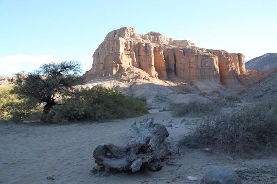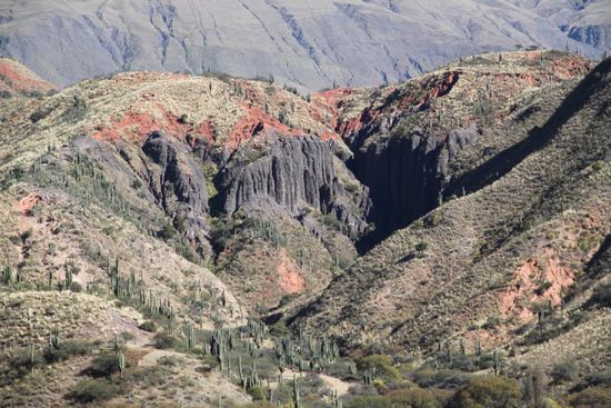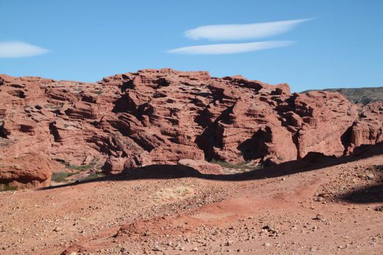 Gefuehlt sind wir in Argentinien losgefahren, dann auf dem Mond gelandet und schliesslich am Mars geendet. Und das alles innerhalb des ersten Tages. Die Landschaft wechselt von grasgruen in eine herbe, kakteengesaeumte Umgebung bis wir durch einen blassroten, felsgekerbten Gebirgszug fahren.