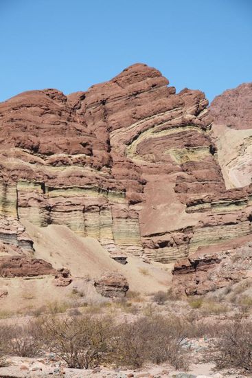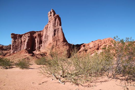 Am zweiten Tag fahren wir durch die Quebrada de las Conchas, die dem ersten Tag in nichts nachstehen. Das Bild wird noch unwirtlicher, die Felsen leuchten wie angemalt in den schillerndsten Farben ueber rot und orange und gruen und gelb und braun und... Unvorstellbar, dass es so etwas in der Natur gibt. Der Gott dieser Landschaft muss ein Hippie gewesen sein, alles bunt und strahlend. Die Pflanzen der Region denken sich wahrscheinlich: Was ihr Felsen koennt, koennen wir schon lange! Eine Hecke leuchtet giftgruen ueber dem roten Sand. Ich nenne sie die "Stirb langsam"-Pflanze. Fass mich an und stirb langsam.