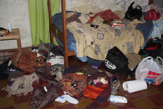 Nein, weder Augen schlecht noch Fliesen schlecht. So sieht es aus, wenn du mit drei Hippie-Belgierinnen in einem Zimmer schlaefst. Zur Ehrenrettung der belgischen Nation vermute ich hinter diesem Saustall einen ausgekluegelten Plan. Selbst einen eingefleischten, ausgebufften Dieb wirds bei diesem Anblick schuetteln. Wie soll man bitte mit einem schnellen Handgriff einen Rucksack klauen, der ueber die Landesflaeche der Schweiz verteilt ist?