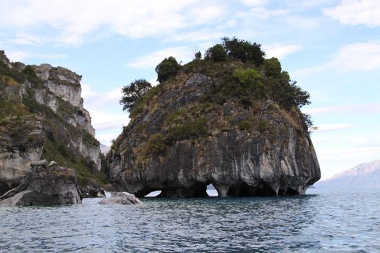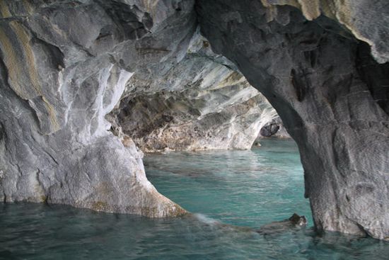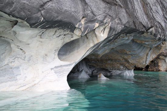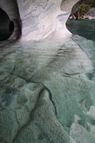 In Rio Tranquilo mache ich eine Tour zu den Marmorgrotten mit, die ueber Jahrtausende mit Wasserkraft in den Berg geschliffen wurden.