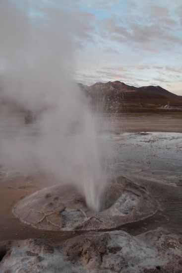 Nach der strapazioesen Tour de Lune lasse ich mich zu Geysiren fahren. Wir starten um vier Uhr morgens. Ja, richtig gelesen. Und das im Urlaub! Das Lodern und Spruehen der Geysire laesst sich nur um den Sonnenaufgang sehen. Die Wueste ist um diese Uhrzeit nicht gerade einladend, es hat -5 Grad und wir stehen dick eingepackt vor diesen heissen Wasserfontaenen. Die Sonne kriecht langsam hinterm Horizont vor und schwups kommt nur noch Dampf aus den Loechern. Das anschliessende Bad in der Therme laesst die Knochen wieder erwachen. Was fuer ein Genuss.