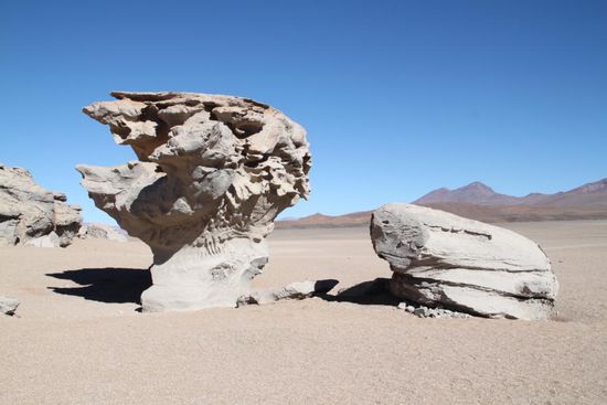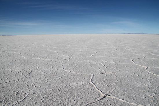 Die Salar de Uyuni ist die groesste Salzwueste der Erde mit 12.000 qkm. Ihre Entstehung liegt etwa 16 Millionen Jahre zurueck, als der suedamerikanische Kontinent noch eine andere Form hatte. Wo sich heute die Anden und die Salzwueste befinden, war vor langer Zeit ein grosser, zum Atlantik offener Salzsee. Mit der Kontinentdrift, der Verschiebung der pazifischen Platte auf den suedamerikanischen Kontinent begann die Bildung der Anden und die Anhebung des Salzsees. Der See wurde zur Salzwueste ausgetrocknet und liegt heute auf 3.650 m Hoehe. Eine gewaltige Leistung der Natur ueber einige Millionen Jahre.