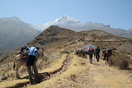 Zwei Tage spaeter starten wir unsere Tour zum Nevado Tocllaraju mit 6.034 m, ein steiler Weg zum Dach Perus. Unser Team ist ausgestattet mit den Fuehrern Hector und Miguel, Koch Cesar und meinen Kompagnons Andres und Arturo aus Kolumbien sowie Reinhold Burkhart. Die Tour ist ueber vier Tage angesetzt und startet an einem kleinen Kiosk als Spaziergang mit Mauleseln in das Basislager Ishinca auf 4.400 m. Dort verbringen wir die Nacht, passen uns an die Hoehe an und tanken Kraft fuer die kommenden zwei Tage.