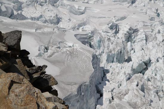 Wir gehen mit Sonnenuntergang schlafen, da wir nachts um zwei die Besteigung in Angriff nehmen. Nachts ist der Schnee hart, also das Risiko von Lawinen geringer und Gletscherspalten zugefroren. Wir gehen zwei Stunden in vollkommener Stille, so, als wollten wir das Eis nicht aufwecken. Die Eislandschaft wird vom Mond schimmernd ausgeleuchtet. Der Aufstieg macht Spass, ich geniesse die Umgebung in vollen Zuegen.