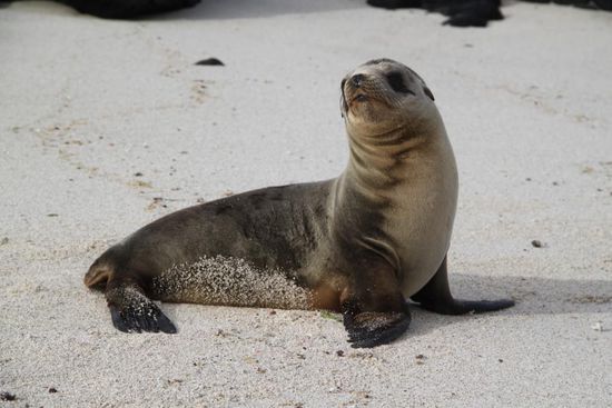 Unser Toern geht ueber acht Tage und startet auf der kleinen Insel Baltra, noerdlich von Santa Cruz. Die erste Landung fuehrt uns an Playa Las Bachas, ein traumweisser Strand mit unzaehligen Klippenkrabben, Meerechsen und einem Flamingo. Der aermste steht ganz allein in einem See. Es soll auch der einzige Flamingo auf unserem Toern bleiben. Staendig gleiten riesige Pelikane am Strand entlang, nur zwei, drei Meter von uns entfernt.