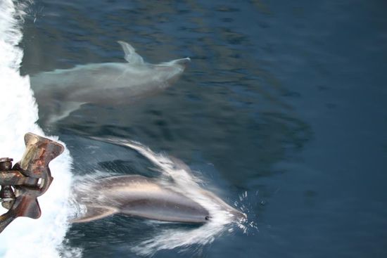 Auf dem Rueckweg zur Hauptinsel Santa Cruz rennt unser Captain auf einmal fuchtelnd und schreiend an Bord rum. Ich verstehe ihn beim ersten Mal nicht und ahne schlimmes, Piraten oder Leck oder Brand. Jetzt ist es soweit, ich erlebe meine erste Schiffsaufgabe. Aber dann wiederholt er nochmal: Dolphins, Dolphins!!! Der erste Schrecken weicht grosser Freude. Ich renne zum Bug und sehe fuenf Delphine durchs Wasser tanzen. Sie begleiten uns eine ganze Weile und posieren im Meer. Du hast das Gefuehl, das sie mit uns spielen wollen und genau wissen, welche Wirkung ihr Geplansche bei uns erzeugt.