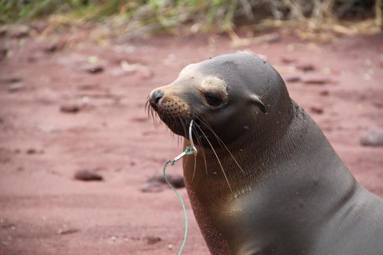 An Tag sechs segeln wir zur Isla Rabida. Wieder bietet sich ein komplett anderes Inselbild mit rotem Strand. Wieder liegen dort meine Lieblingstiere faul am Strand: Seeloewen. Doch einer sitzt veraengstigt und belaemmert am Ufer, mit einem Fischerhaken im Maul. Unser Fuehrer und der tapfere Daene Finn operieren den Haken mit Zange und Messer heraus. Du kannst dir vorstellen, dass dies einem Seeloewen ohne Narkose gar nicht in den Kram passt. Jetzt erklaer ihm mal, dass du ihm helfen willst, aber dazu eine Ecke aus seinem Maul schneiden musst. Er bruellt und wehrt sich, will die Amateur-Chirurgen beissen. Ich weiss nicht, um wen ich mehr Angst haben soll, den Seeloewen oder das Chirurgen-Duo. Am Ende ist der Haken raus. Ein bisschen Wikinger steckt in den Daenen wohl immer noch drin.