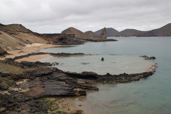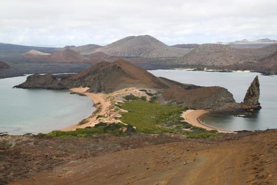 Die Vulkaninsel Bartholome ist eine Besonderheit, ein Vulkan ohne Hauptkrater, sondern 36 kleinen Nebenkratern, die die Insel ueberziehen. Das Gestein ist sehr poroes und tuffig, das heisst zu einem grossen Teil aus Asche bestehend, die untermeerisch erloschen ist. Die Insel sieht aus, als wuerde sie jeden Moment unter sich zusammenbrechen.