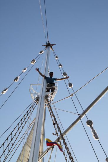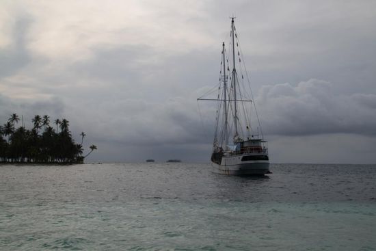 Wir verbringen die Ueberfahrt zu den Inseln mit Lesen, Quatschen und ganz verrueckte mit Mastklettern. Wenn du 20 m ueber Deck stehst, hat der Mastkorb einen ganz schoenen Ausschlag zur Seite. Ist also nur fuer seefeste geeignet. Nach 33 Stunden erreichen wir San Blas in der Dunkelheit. Die einzigartige Schoenheit der Inseln kann man schon erahnen.