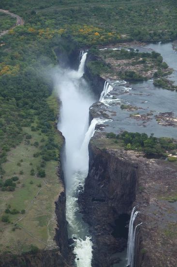 Laut eines namhaften Mitreisenden sollen die Victoria Fälle die schönsten Wasserfaelle der Welt sein. Ich bin also sehr gespannt, was mich erwartet. Ich buche einen Rundflug per Helikopter über den Wasserfall, fliegen über den Flusslauf an und sehe in der Ferne die Gischt aufspritzen. Das Wasser donnert 100 m tief ins Tal. Die Bruchkante zieht sich über 1.700 m und ist nach der Regenzeit komplett geflutet.