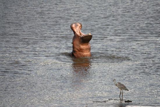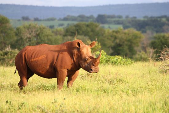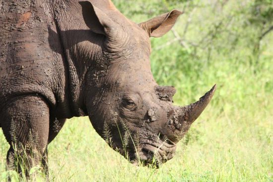 Wir fahren weiter durch die Praerie, schon etwas gelangweilt aufgrund der duennen Tierdichte im Park, als Jan und und ich mit einem Schrei Verena vor Schreck fast durchs Dach befoerdern. Wir haben ein Nashorn entdeckt und freuen uns wie Kinder. Gelangweilt steht es auf der Wiese und grast. Unsere Neugier stoert es nicht im geringsten. Diese Tiere sind so massig und etwas furchteinfloessend mit ihrem starken Horn.