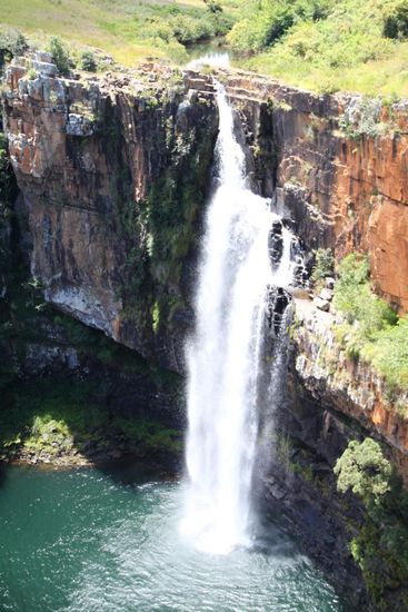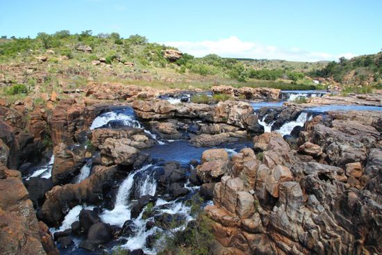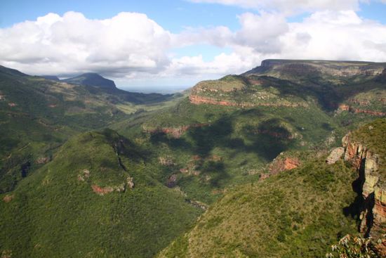 Wir fahren von dort an den bunten und wuchtigen Blyde River Canyon, die grosse Attraktion in dieser Region. Der Fluss Blyde wird ueber viele Zulaeufe gespeist, die ueber unzaehlige Wasserfaelle in die gigantische Schlucht fliessen. Das Farbenspiel am Canyon erinnert stark an seinen grossen Bruder in den USA.
