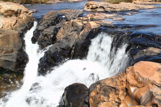 Das Wasser graebt sich ueber Jahrmillionen in den Fels und hinterlaesst im harten Gestein durch Verwirbelungen sogenannte Potholes. Beim Anblick dieses Kunstwerks wird doch jeder Steinmetz blass.