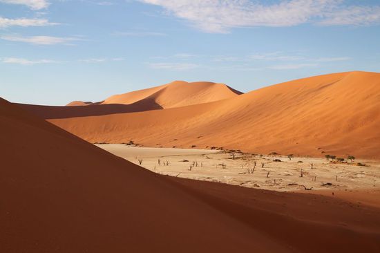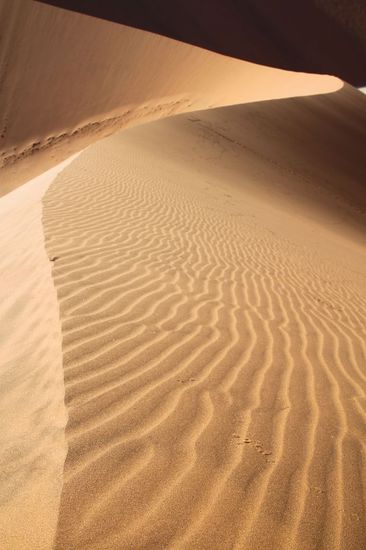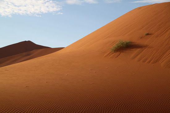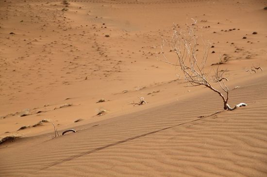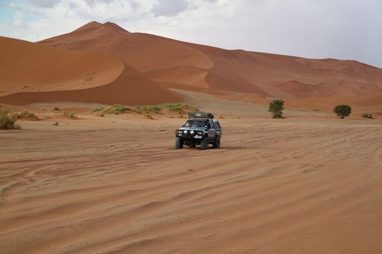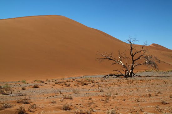 Wir fahren mit unserem Auto, das in der Hitze nach und nach Zerfallserscheinungen an den Tag legt, nach Sesriem am Rande der Wüste. Wir sitzen wie Löwen unter einem Baum und weichen der brütenden Mittagshitze aus, als ich einen Blick über die Schulter werfe und einen Sandsturm anfahren sehe. Da wird dir erstmal anders, aber am Ende ist es nur Wind mit viel Sand, der sich in Mund, Nase und Augen setzt. Ein Peeling für die Atemwege. Wir entscheiden uns durch den Wind in die Wüste zu fahren, wo bestes Wetter herrscht. Über Sandpisten erreichen wir die atemberaubende Dünenlandschaft Sossusvlei und marschieren eine Düne hoch. Es ist zwar schon später Nachmittag, aber der Sand kocht und treibt dir den Schweiß aus den Poren. Du gehst einen Schritt vor und rutscht zwei zurück. Mühsam finden wir unseren Weg zur Spitze und genießen die traumhafte Aussicht über die Dünen. Es ist alles so unwirtlich für uns Menschen und doch wieder faszinierend.