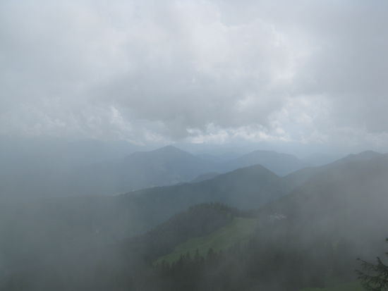 Die Berge waren schon zu sehen als wir Bad Tölz erreichten. Nach c.a 4 Kilometern merkten wir plötztlich, wie scheissenschwer der Rucksack doch ist ! Vielleicht hat Herr Grassler, der Verfasser des Buchs ja doch etwas Ahnung was das Wandern betrifft, aber die Genugtuung gönnen wir ihm auf keinen Fall ! Wir liefen weiter, bis nach 300 Metern ein netter Gasthof in Sicht war. Nach ein paar Bierchen läuft es sich bestimmt viel leichter. Nachdem wir bestellt hatten und die Bedienung um die Ecke war, mussten wir schon dolle über den Bayrischen Dialekt schmunzeln. Gemütlich ausgetrunken und öfters nachbestellt, gings dann weiter- sind ja nur noch läppische 14 Kilometer bis zu unserm Tagesziel. Laut Wanderkarte waren zwei Varianten möglich, der entspannte Aufstieg aus dem Tal und die gefährliche Gratwanderung nach einer kurzen Fahrt mit der Seilbahn. Den Berg hochfahren hört sich gut an ! Also nahmen wir die halsbrecherische Gratwanderung. Rein in die Seilbahn und los gehts. Irgendwie wurde mir nach c.a 300 metern höhe ganz mulmig, der Blick nach unten entlang der steilen Felsen war sehr beunruhigend. 1555 meter war der Berg hoch, und um das ungute Gefühl noch zu toppen zogen rasend schnell Wolken um unsere Gondel, sodass die Sicht unmöglich war. Ich hoffte auf einen schnellen Tod oder ein baldiges Ende der Fahrt !