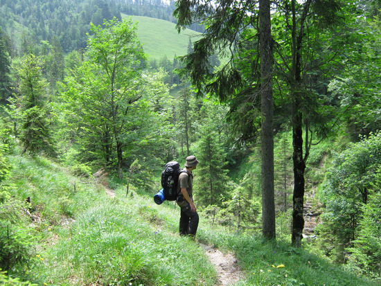 Nach langer Diskussion ob wir abbrechen sollten, entschieden wir uns weiterzugehen. Aber nur noch die empfohlenen Varianten ! Sind Richtung Jachenau gewandert, fast nur Abstieg. Wir waren aber erstaunlich gut in Form und hatten keine Muskelschmerzen. Es ging durch Wälder, über kleine Berge (>1000m) und durch Auen, die etwas an Hobbiton erinnerten. Unsere Motivation stieg wieder !