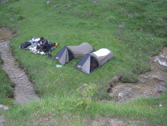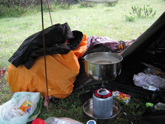 Kurz nach Aufbau kam ein Wetterumschwung. Es fing wieder an in Strömen zu regnen. Also bauten wir unsere Plane über beide Zelte und kochten in dem zwischenraum mal wieder Spaghetti !
