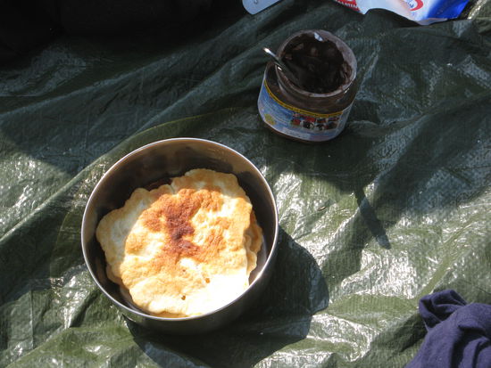 Nach 20 Kilometern leichten auf und ab schlugen wir unser Lager auf einer hügeligen Hobbitwiese auf. Heute wollten wir Brot backen ! Naja, das was rauskam war ein Brot/Pfannkuchen gemisch, aber es war wirklich essbar. Mehl, Milchpulver, Eipulver, Hefe und alles was man mit Wasser zu Nahrung aufbereiten konnte war in unserer Reiseküche vorhanden. Geschmack gewöhnungsbedürftig, aber nach langen Wanderungen kann man fast alles essen ! So ab ins Bett