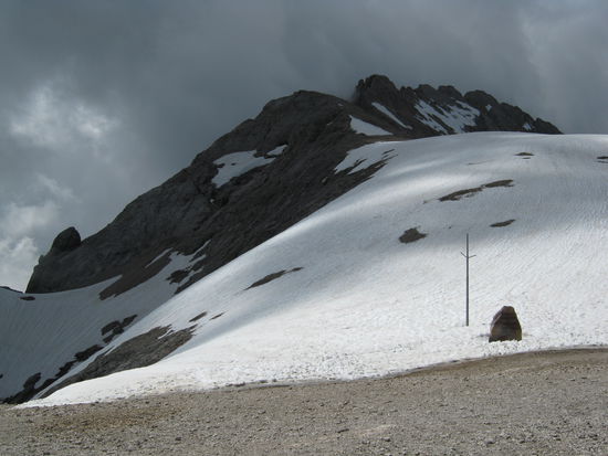 Unterwegs nen kleinen Wasserfall vom Gletscher der Marmolada gesichtet, nix wie hin Wasser auffüllen ! Aber dazu mussten wir erstmal über eine dicke Schneedecke. oben angekommen konnten wir dann doch nichts abzapfen: Das Fließende Wasser hat einen Hohlraum in die Schneedecke geschmolzen, durch die man höchstwahrscheinlich durchbricht wenn man näher ran geht.