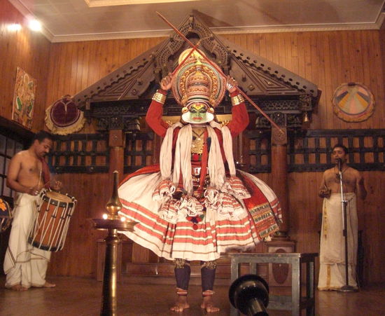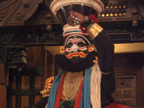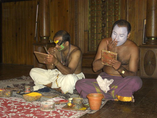 Sehr beeindruckend war die Kathakaliaufführung. Bei dieser Art des Theaters sind nur Männer die Akteure. Alleine die Schminkzeremonie ist sehr einnehmend, wie gekonnt sich die Künstler bemalen und wie routiniert die Gesichtsmasken aus Papier und Reiskleber hergestellt und im Gesicht befestigt werden. Alle Farben mit denen sich die Künstler schminken sind Naturfarben. Die Ausbildung der Künstler dauert um die 6 Jahre. Bei der Aufführung wird nicht gesprochen, sondern durch Mimik und verschiedene Augen, Körper- und Handhaltungen erzählt. Bei Festen dauern solche Vorführungen mitunter die ganze Nacht, was sicher sehr kräftezehrend ist bei den opulenten Kostümen.