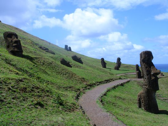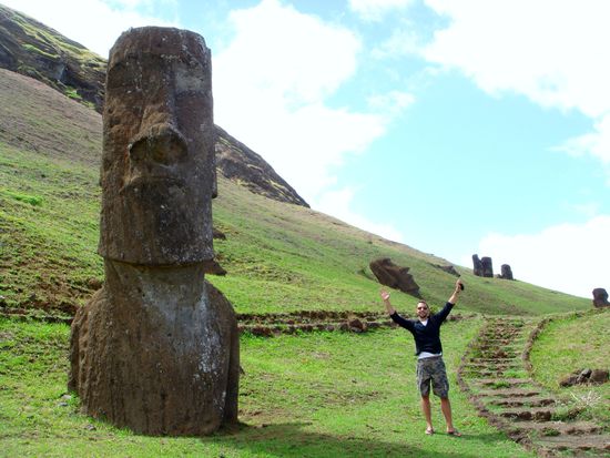 Nach dem Fruestueck mieteten wir uns eine 250ccm Motorrad um die Insel auf eigene Faust zu erkunden. (15.000 fuer 8 Std.) Bei strahlenden Sonnenschein auf Feld und Schotterwegen unterwegs. Vorbei an den Moais, den bekannten Steinstatuen. Diese sind leider alle mit der Zeit umgefallen. Nur durch die Hilfe der Japaner, wurden einige wieder aufgestellt, weil Sie sich frueher mal einen ausgeliehen hatten. (Wie freundlich*) Die Tour fuehrte an der Kueste entland Richtung Anakena, zum Strand mit aufgestellten fuer Postkarten Moais, und zurueck an Rano Raraku vorbei. Dort entstand ein Moai, wurde aus dem Vulkanstein gemeisselt.