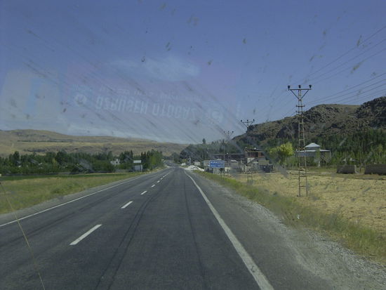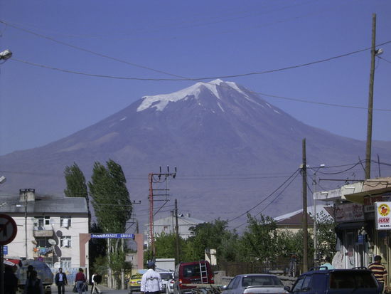 Johanna und ich wollen heute mit nach Dogubayazit fahren, wo die Araratbesteiger abgeholt werden sollen. Mit einem Kleinbus geht es Richtung Norden. Wir fahren durch kleine, heruntergekommene Städte, wie Muradiye und Caldiran. Die gleiche karge Landschaft wie schon seit Tagen begleitet uns. Wir fahren einen Pass hinauf und bald erhebt sich zu unserer Linken der kahle Rücken des Tendürek, ein 3 500 Meter hoher, erloschener Vulkan. Eine schwarze Lavalandschaft umgibt den Berg. Zur Rechten, nur einen Steinwurf entfernt, verläuft die Iranische Grenze. In kurzen Abständen stehen kleine Türme auf den sanften,grünen Hügeln. Dann tritt er plötzlich hinter einer nahgelegenen Bergkette hervor. Majestätisch erhebt sich der schneebedeckte Gipfel des Ararat vor uns. Messerscharf sticht er vom glasklaren, blauen Himmel ab und ist von nun an unser Begleiter.