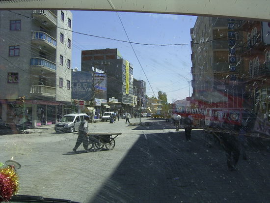 Wir fahren zum nahe gelegenen Ishak Pasha Seray, ein burgähnlicher Palst, des osmanischen Emirs. Er wurde zwischen 1685 und 1784 erbaut und enthält armenische, georgische, persische, seldschukische und osmanische Baustile. Außerdem gab es eine Moschee, einen Harem und ein Hamam. Finanziert wurde der Prunkbau, der über 360 Zimmer umfasste, durch Wegelagerei. Der Emir verlangte reichlich Zollabgaben von den Karavanen, die hier einst vorbeizogen. Nach der Besichtigung gibt es in einem kleinen Restaurant, oberhalb des Palastes gelegen, ein leckeres Picknick. Unter den Bergsteigern sind auch ein paar Schweizer. Einer hat lange, graue Haare, die er zu einem Zopf zusammengeflochten hat. Schon von Anfang an fand ich den Gedanken, einmal daran zu ziehen, belustigend. Dieser will jetzt in Dogubayazit zum Berber und sich traditionell mit Rasierklinge rasieren lassen. Jetzt finde ich den Gedanken lustig, dass es dort zu Verständigungsproblemen kommt, und der Berber den Zopf aus Versehen abschneidet. Wir haben noch eine Stunde Zeit, uns in Dogubayazit umzusehen. Im Bazar kaufe ich Tee und eine kurdische CD von Zilan û Derman. Der Ararat ragt ganz klar und riesig hinter den Häusern der Stadt auf. Ein einmaliges Landschaftserlebnis. Ein alter Mann mit langem schwarzgrauem Bart und weißer Häkelmütze steht mit einem jüngeren am Straßenrand und zeigt ihm eine Pappkiste. Vielleicht schließen sie gerade eien Handel ab.