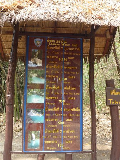Leider mussten wir das schöne Camp nach dem Frühstück schon verlassen und fuhren zum Erawan Nationalpark. Da gibt es einen 7-stöckigen Wasserfall (also einen Wasserfall, der sich in 7 größere Zwischenbecken ergießt, in denen man schwimmen kann).
