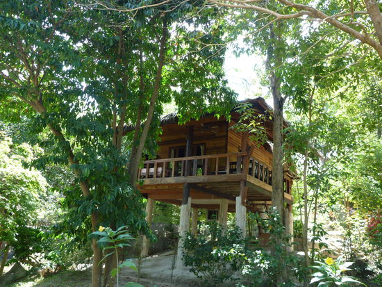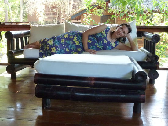 Dort wurde ich nach einem Welcome Drink zu meiner neuen Unterkunft gefuehrt: Ein Traum! Wie ihr wisst, finde ich Stelzenhaueser ja so toll, und hier wohne ich in einem! Aus Holz, und richtig edel, mit grossem Balkon mit Sofa (!!!).