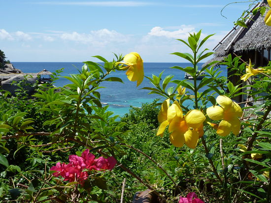 Auf dem Balkon weht immer eine leichte Brise und durch die Baeume, in denen sich Eichhoernchen und freche Minah-Voegel vergnuegen sehe ich das tuerkisblaue Meer.