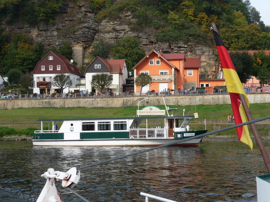 Nach dem Besuch dieses Touristenmagnetes begann nun auf direktem Wege unterhalb der Felsenburg der Abstieg hinunter zu unserem Ausgangspunkt Kurort Rathen. In einem Café mit Blick auf die Elbe legten wir eine letzte Rast ein und stärkten uns bei einem leckeren Eisbecher und genossen die wärmende Herbstsonne auf der Aussichtsterrasse.