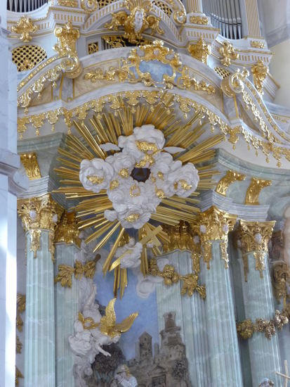 Derart beeindruckt von Kunst und Kultur setzten wir jetzt noch eins drauf: zwar hatten wir das mittägliche Orgelkonzert in der Frauenkirche verpasst, doch dafür gelangten wir jetzt am Nachmittag ohne lange Menschenschlangen direkt hinein in das imposante Gotteshaus. Die Kirche symbolisiert den Wiederaufbau Dresdens wie wohl kein anderes Gebäude. Ich hatte mir die Kirche aus den Presse- und Fernsehberichten wesentlich größer vorgestellt. Umso mehr beeindruckte uns die schlichte Eleganz und Schönheit. Kein barocker Prunk, aber auch keine kühle Nüchternheit. Hell, klar und freundlich wirkte die Kirche auf uns und wir konnten sie in aller Ruhe ohne großen Rummel genießen.