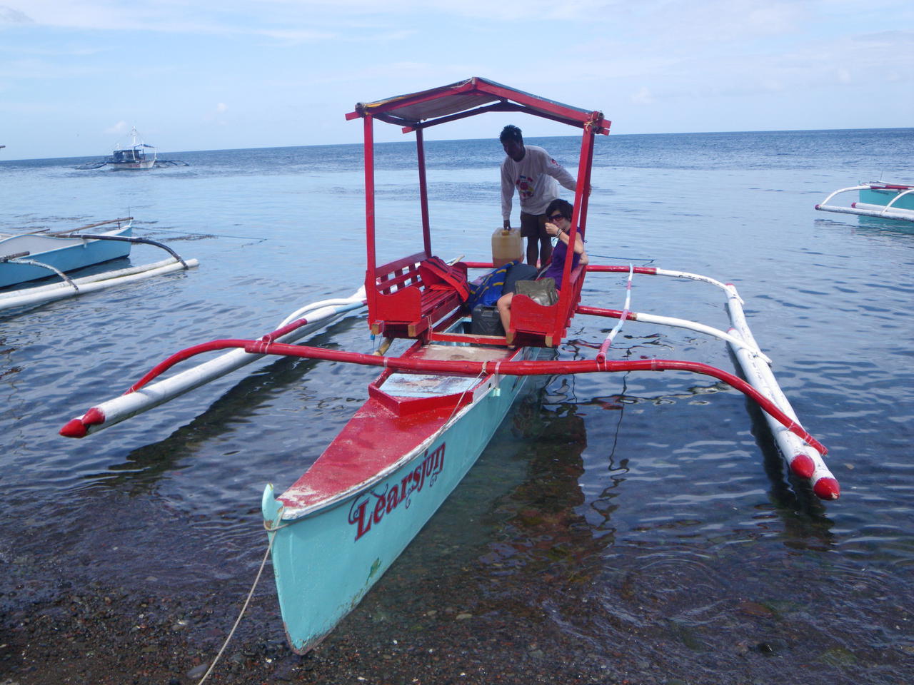 Insgesamt waren wir eine Woche auf Camiguin, als nächstes wollten wir nach Dumaguete, wir machten uns in der Früh auf den Weg zur Fähre, die um 8:30 ablegen sollte, wir kamen sieben Minuten nach 8 an, aber die Fähre war schon weg... Am Ticketschalter erklärten sie uns, dass die Fähre immer um 8 abfahren würde(2 Tage vorher sagten sie uns aber 8:30) und dass nur eine Fähre pro Tag fährt, blöd gelaufen! Wir wollten aber unbedingt zurück nach Bohol, damit wir nach noch am selben Tag nach Dumaguete kommen würden. Ein Einheimischer bot uns dann an, er kennt jemanden der uns mit einem Boot nach Bohol bringen würde, da wir beide noch am gleichen Tag weg wollten, stimmten wir zu. Beim Boot angekommen, sahen wir eigentlich nur winzige Fischerboote, mit denen sollten wir 60km übers Meer fahren?!