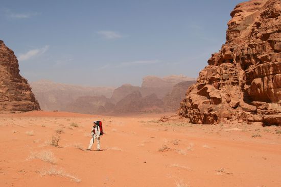 Wider Erwarten geht es in Wadi Rum auch billiger als eine Jeep-Pauschaltour fuer ueber 100 Euro, dafuer muss man aber Fussschmerzen in Kauf nehmen! Eine Iranerin, die wir in unserem Auto mitnahmen, gab uns den Tipp, dass man die Umgebung zu Fuss in 5 Stunden erkunden kann. Nach einem kurzen Abendspaziergang fassten wir also folgenden Plan: morgens loswandern mit den Schlafsaecken auf dem Ruecken, ein Camp ansteuern, dort unser Gepaeck lassen und weiter per pedes oder Kamel.
