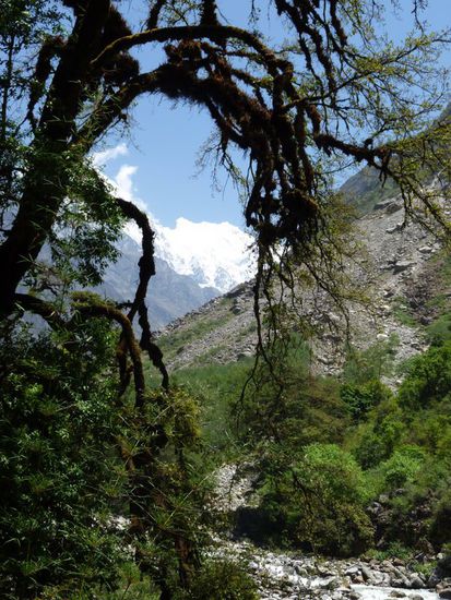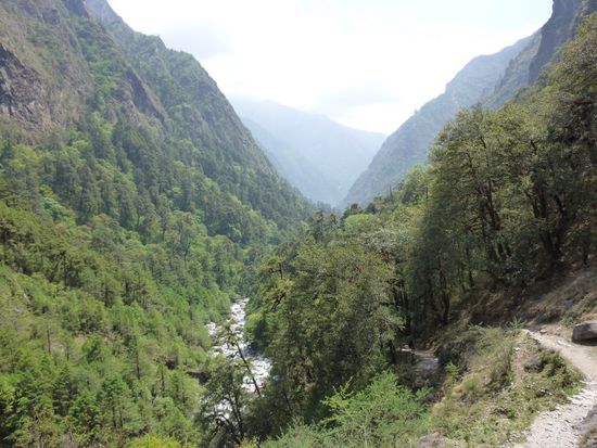 Am Checkpoint (1400 m) vorbei ging es ueber die ersten beiden Haengebruecken immer bergauf und wieder bergab am Fluss entlang in Richtung unseres Mittagsstopps Bamboo. Dort angekommen, waren wir schon voellig verschwitzt und fertig. Nach einer guten Staerkung ging es aber wieder fit weiter bis zu unserem Tagesziel Lama-Hotel (2400m).