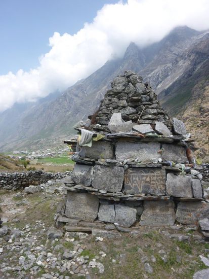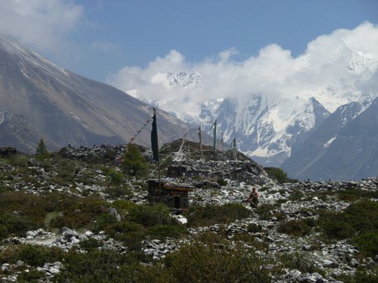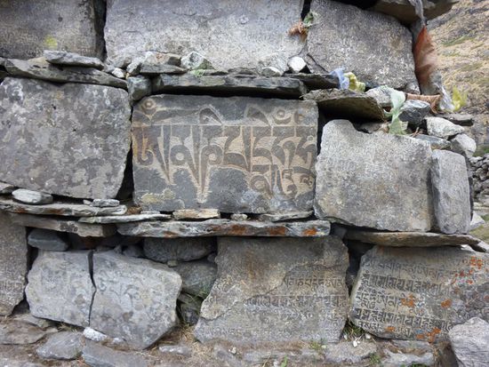 Hinter Langtang ging man an vielen buddhistischen Mani-Mauern, bestehend aus Gebetssteinen, entlang, die gut den hier oft spuerbaren tibetischen Buddhismus repraesentieren.