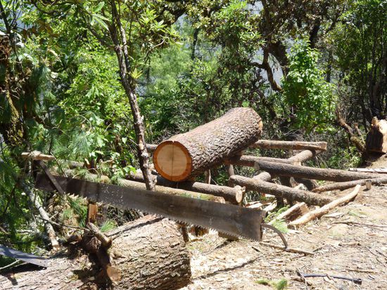 Tag 8 versprach ein kurzer Tag zu werden, doch verlasse dich nie auf die Zeitangaben eines Nepali, der in den Bergen aufgewachsen ist! Statt lockerer drei Stunden wurden es dann doch 5. Was ja halb so schlimm ist, aber das letzte Stueck nach Dunche, dem Ende unseres Treks, fuehrt ueber die schonmal erwaehnte staubige Strasse. Dazu wurde es richtig heiss! Trotzdem hatten wir bis dahin mal wieder ganz neue Eindruecke. Diesmal ging der Weg recht breit wie durch unseren Nadelwald. Immer wieder kam man an Stellen vorbei, an denen Arbeiter die frisch gefeallten, riesigen Baeume mit riesigen Saegen in Balken zersaegten, die dann wie immer auf dem Ruecken abtransportiert wurden.