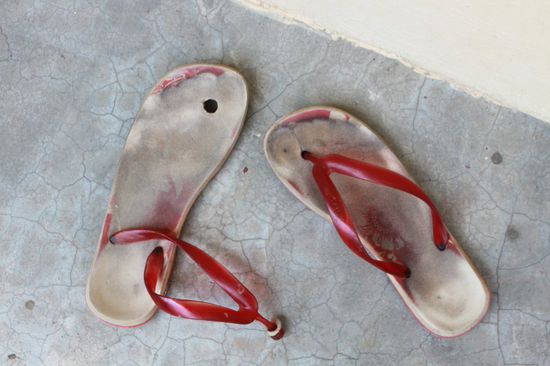 Nach acht Jahren treuen Dienstes, die wir gemeinsam durch saemtliche Urlaube gingen, haben sich heute meine Flip-Flops (Isis) verabschiedet. Nach einer nassen Kletteraktion hat es den Zwischenzehriemen nicht mehr in seiner Verankerung gehalten. Auch eine Not-OP mit Gaffa-Tape konnte sie nicht retten. Bei der Flucht vor dem naechsten Regenguss riss die Wunde wieder auf und war nicht mehr zu heilen.