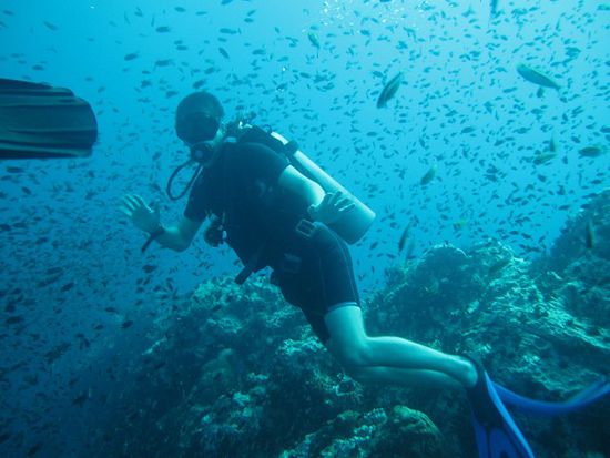 An Tag 3 gings dann morgens um 7 raus zum Tieftauchen am Chumphon Pinnacle. Die bisher geilste Divesite wo ich war! Riesige Felsen unter Wasser und tolle Felsformationen mit tausenden von Fischen. Sind dort bis 31,4 m runter und mussten einige Rechenaufgaben loesen da manche Leute in solchen Tiefen besoffen werden - seltsames Phaenomen aber ist wohl so! Danach sind wir dann noch rumgetaucht und haben einen Schwarm Barracudas sowie nen Lionfish gesehn.