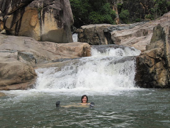 Neben einem sehr schoenen Campingplatz gab es tolle Badestellen im Wildwasserfluss, sogenannte Rockpools, und eine sehr schoene Flora und Fauna. Eine Schildkroete war auch dabei. Aber als diese abtauchte war Jule ganz schnell wieder aus dem Wasser.