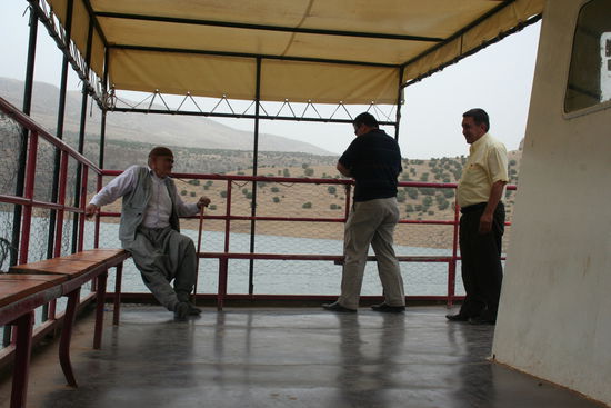 Es ging weiter. Wir nahmen eine Fähre über den Atatürkstausee Richtung Siverek bzw. Diyabakir (Hauptstadt der Kurden). Das war wirklich beeindruckend. Wir wollten in Siverek schnell ein paar Dinge einkaufen und dann weiter nach Hasankeyf. Diyabakir wollten wir umgehen, obwohl es sicher eine sehenswerte Stadt ist. Wir wollen eher in der Natur bleiben momentan. In Siverek suchten wir eine Bank und das war schon garnicht so einfach, da auch die Polizei uns nicht recht verstand. Nun fanden wir sie aber doch und gingen im Zentrum ein bisschen einkaufen. Dort wo wir hielten, fragten wir einen Mann in seinem Oliven-Ayran-Geschäftchen, ob wir hier stehen bleiben könnten und natürlich konnten wir dies und wir bekamen gleich zwei riesige Ayran geschenkt und er sagte uns wir wären hier nicht mehr in der Türkei sondern in Kurdistan. Wir liefen umher. Wurden von drei Leuten in einem schönen Innenhof mit vielen Bögen zum Tee eingeladen und versuchten mit unseren wenigen Worten zu verständigen. Alle lachten dauernd und versuchten alles Mögliche zu erfahren, schöne Musik spielte im Nebenzimmer und sie sagten, dass es am Abend Musik gäbe und die Band gerade übe. Martin wurde aufgefordert mitzuspielen, aber das tat er natürlich nicht.