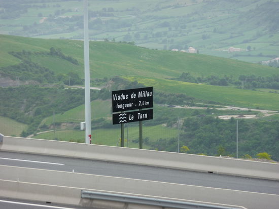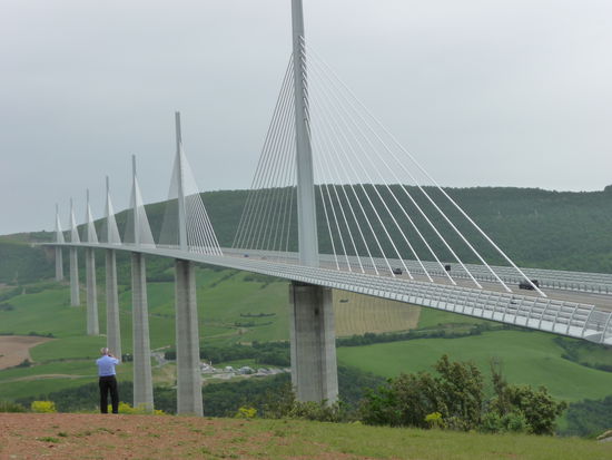 Die Fahrt auf der A75 war dann wirklich der Knaller. Landschaftlich ist die Strecke einfach wunderschön und es gibt unterwegs viel zu sehen. Etwa die schwarze Kathedrale von Clermont-Ferrand, die Vulkanberge der Auvergne, die Autobahn steigt hinauf auf fast 1200 Meter Höhe (hieß für uns kurzzeitig Klima-Anlage bei 28 Grad Außentemperatur ausschalten und Heizung hochfahren, weil die Kühlwassertemperatur in bedrohliche Bereiche stieg) und der absolute Höhepunkt war schließlich das Viadukt von Millau über die Tarn-Schlucht. Ein beeindruckendes Bauwerk, das von einer Rastanlage aus besichtigt werden kann. 9 Euro kostete die Überfahrt für das Gespann, aber jetzt können wir von uns behaupten "J'ai traversé le viaduc de Millau".
